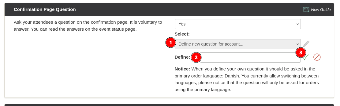 You can also create your own questions. However, these will not be translated and therefore not displayed if attendees register in a language other than Danish or English.