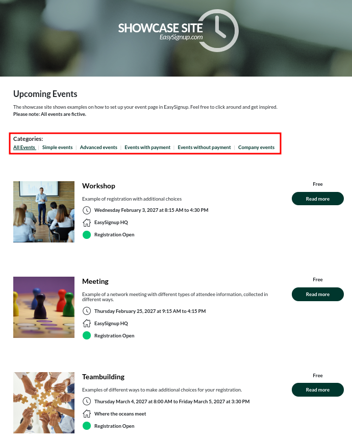 In EasySignup you can divide your events into different categories, if you have chosen for the event to be visible on your public list of current events.