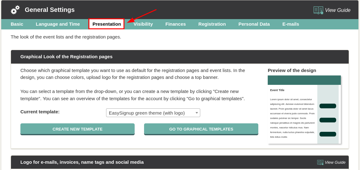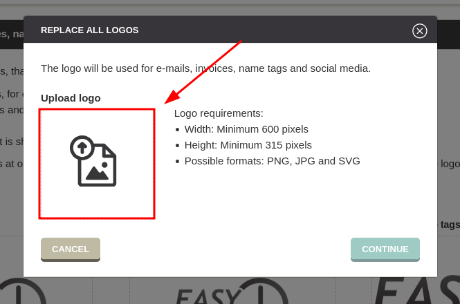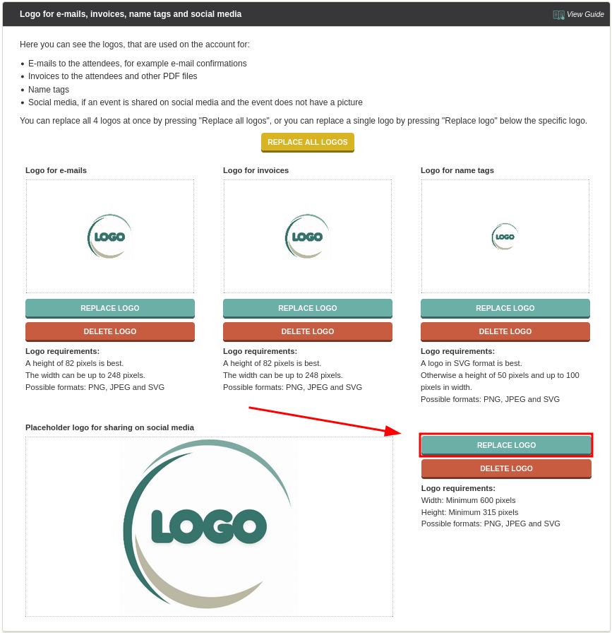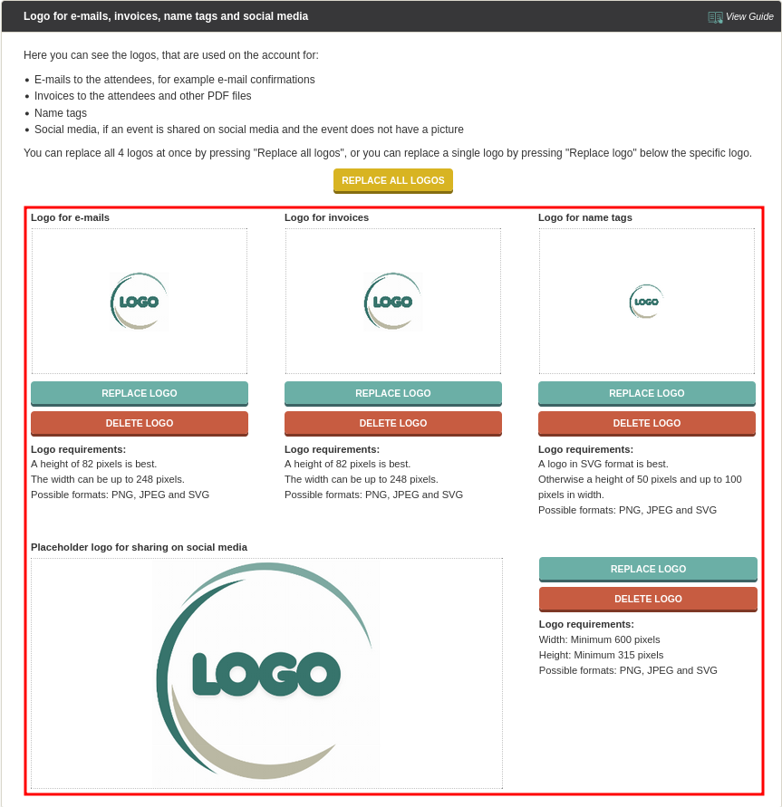 If you want to have a logo on e-mails, invoices, name badges, and when sharing events on social media, you have the option to upload one or more logos.