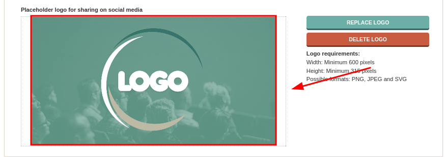 Backup logo for social media: The width must be at least 600 pixels and the height must be at least 315 pixels. The backup logo is used automatically if there is no image in the event description or if the image in the event description is too small.