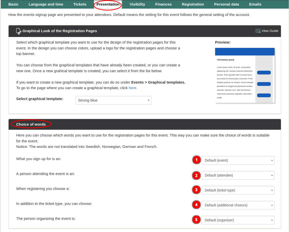 For example, you can choose to use the word "party" instead of "event" to match the type of event you are hosting. The word will be replaced various places on the registration pages, for example here: