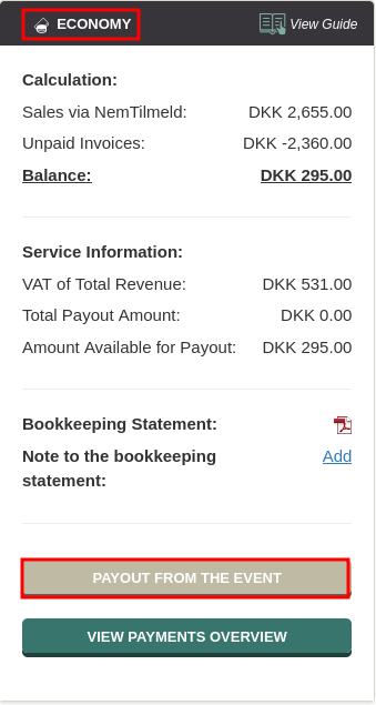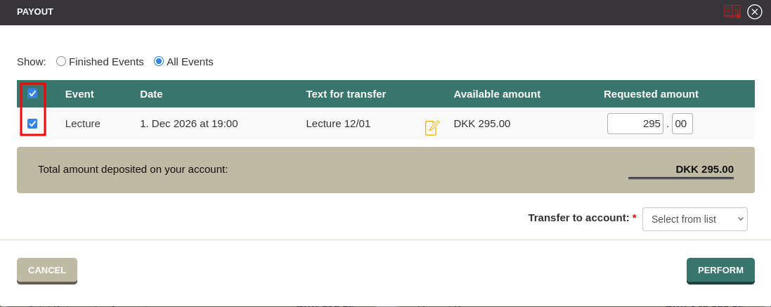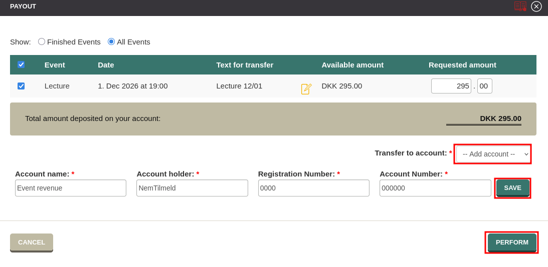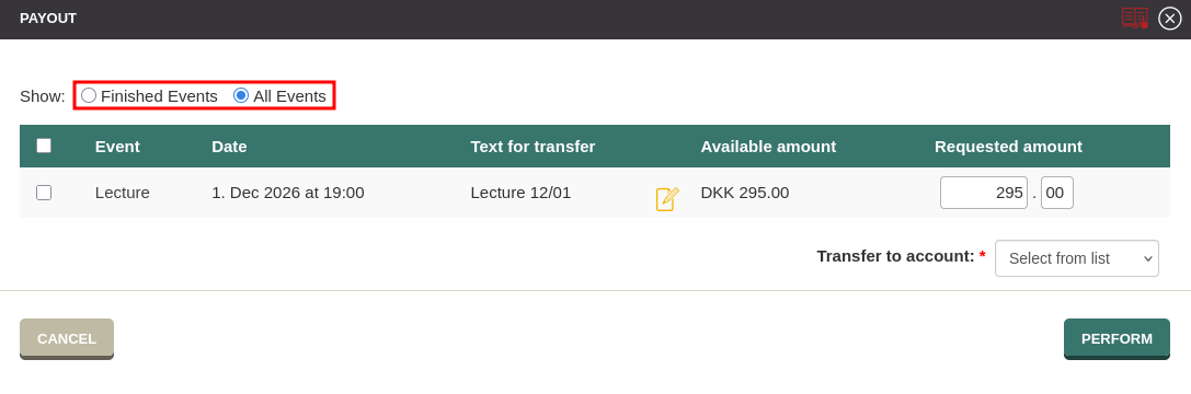 Note: Each event does not have a separate balance. The account has one total balance. Refunds, attendee fees and payouts from one event may affect the possibility to transfer revenue from another event or refund an attendee until there are sufficient funds available.