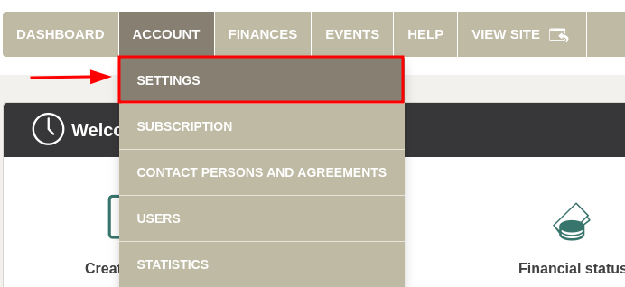 Next step is to control that the contact information about you is correct. Click Account -> Settings to enter information about the organizer.