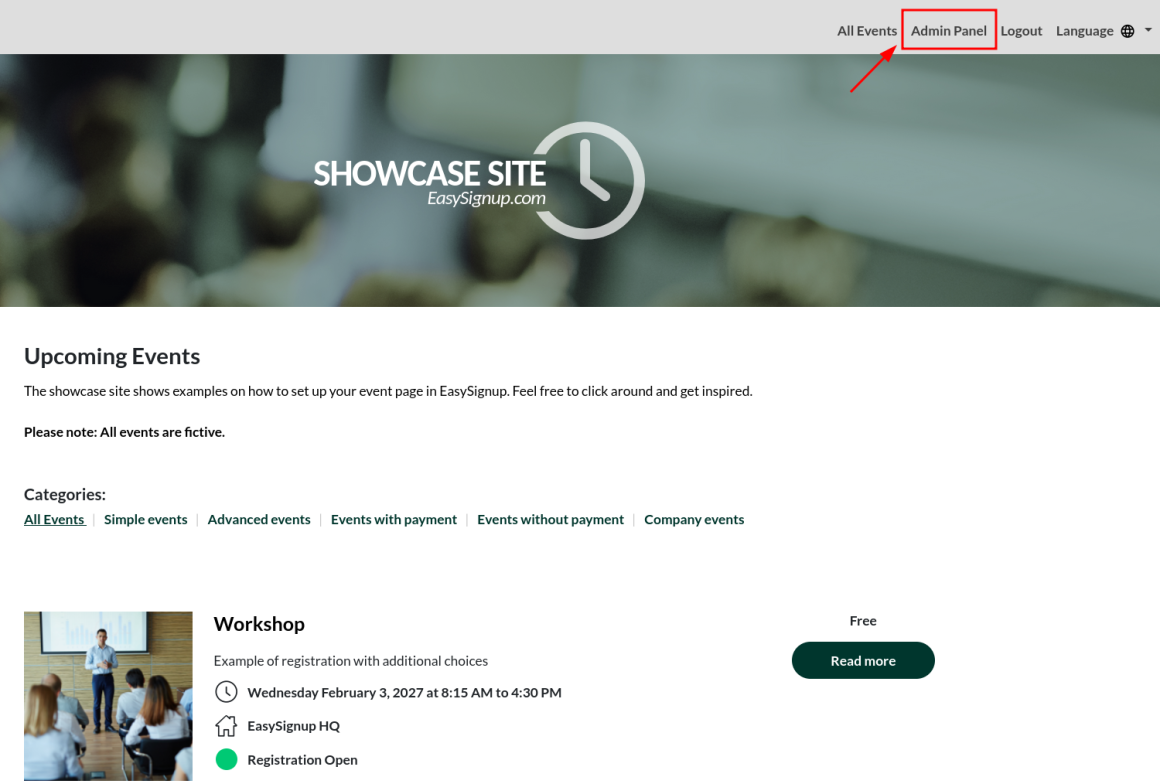 You can share your own link with yout list of current events, if you wish to advertise all your events. Find the link to the front page by clicking “View site” in the top of the dashboard.