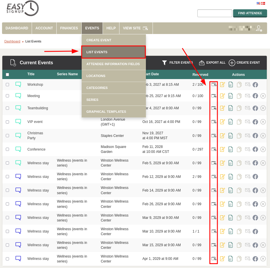 Each event has a unique registration link, which you can share if you wish to advertise a specific event, e.g. if it is “Invite only”. You can find the event registration link in the list of events in the dashboard. Simply click on the first icon under “Actions”.