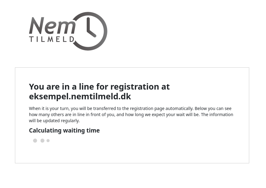 Users exceeding the site capacity are automatically offloaded to the queue system. As capacity opens up, the queue system redirects users waiting back to the registration site in the correct order. Users in line are presented with a queue number and an estimate of how long they have to wait.
