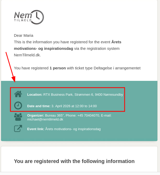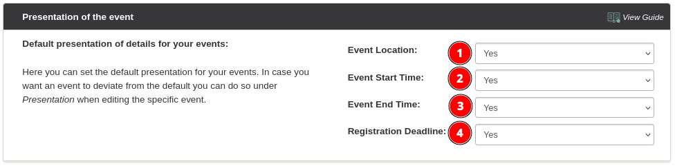 You can choose whether start date, end date, registration deadline and location are displayed on registration pages and in confirmation e-mails.